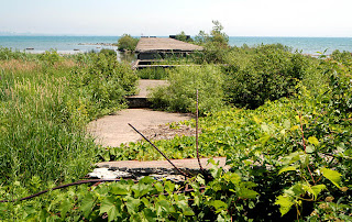 A pleasure boat passes the old steamship pier as it heads out of Lake Erie and into the Niagara River. In the early part of the 20th century ships would dock at the end of the pier (the furthest portion of the broken-down cement structure is obscured behind the brush growing in the upper right) as they transported thousands of people each day to the Erie Beach Amusement Park.